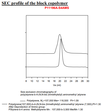 用尺寸排阻色譜法分析聚合物(SEC)以獲得分子量和多分散指數(shù)(PDI)。最終的嵌段共聚物由1H-NMR計算組成通過比較苯乙烯的峰面積進行光譜分析質(zhì)子在6.3-7.2ppm,峰面積在3.76。在CdCl3中對氨基保護基與三甲基甲硅烷基。嵌段共聚物PDI由SEC測定
