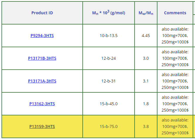 | 聚(3-正已基噻吩-2,5-diyl)-b-聚(苯乙烯), diblock co聚mer | PMS-P13159-3HTS-500mg | 查看 |