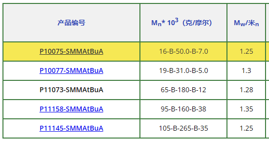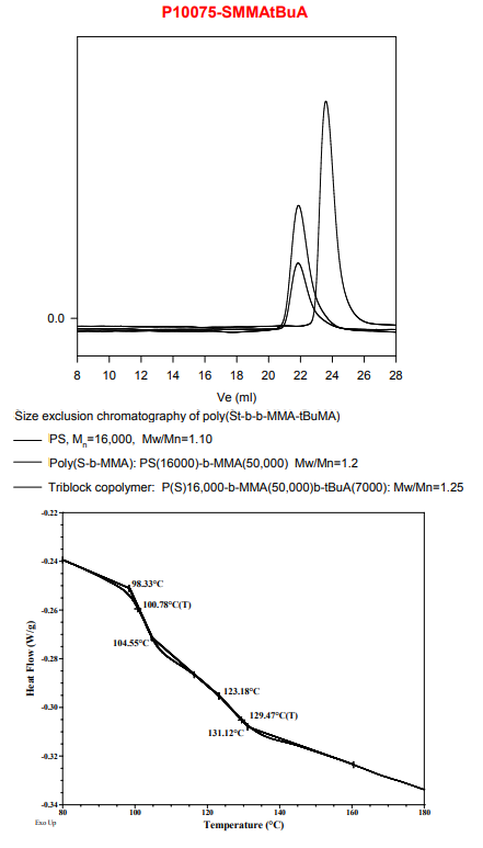 聚(苯乙烯)-b-聚(甲基丙烯酸甲酯)-b-聚(tert-butyl 丙烯酸酯)產品: