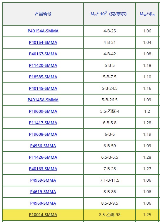 聚(苯乙烯)-b-聚(甲基丙烯酸甲酯), PMMA block is syndiotactic (>78%)部分產(chǎn)品: