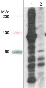 Western blot分析A431細(xì)胞用calyculin A (100 nM)處理30 min (lane 1),然后用lambda磷酸酶處理30 min (lane 2)。印跡用抗磷酸絲氨酸/蘇氨酸兔多克隆在1:1000進(jìn)行探針。