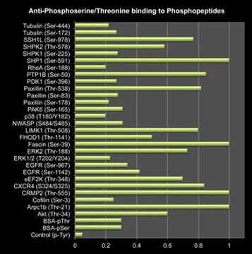 圖中顯示抗磷絲氨酸/蘇氨酸抗體(PP2551)與多種磷絲氨酸和磷蘇氨酸肽結(jié)合,但不與含有未磷酸化絲氨酸或磷酪氨酸的控制肽結(jié)合。