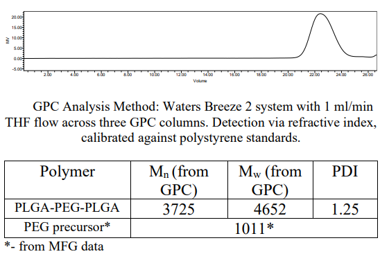 PLGA-PEG-PLGA / 聚(丙交酯-共-乙交酯)-b-聚(乙二醇)-b-聚(丙交酯-共-乙交酯),(Mw ~1,100:1,000:1,100 Da) LA:GA 75:25基本參數: