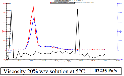 在具有60mm 2°錐體的AR2000(TA儀器)上進行流變學在4°C攪拌下,在溶解于水中的20%w/v聚合物上,歷時3天。溶液在0.1(秒-1)時的粘度)并測量5°C(1分鐘峰值保持5秒的測試間隔)。通過在常數6.283下振蕩進行的流變學rad/s,0.1%應變,增量為1°C,范圍為5-45°C,持續1分鐘每個點的溫度平衡 |