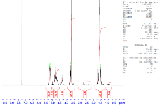 共聚物在CDCl3中的H-NMR光譜(Bruker≥300MHz,PINMRF)核磁共振譜分析PLGA-PEG-PLGA共聚物:EG/LA-GA=23/21-10(錳EG/LA:GA 1013/1513:569 Da) |