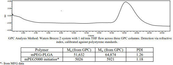 mPEG-PLGA / 甲氧基聚(乙二醇)-b-聚(丙交酯-共-乙交酯),(Mw ~5,000:55,000 Da)LA:GA 50:50基本參數: