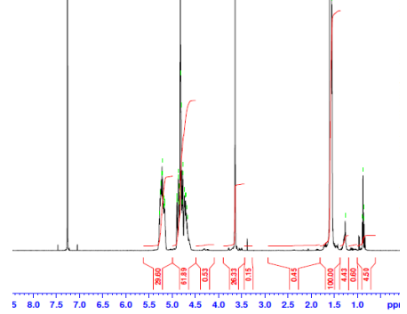 共聚物在CDCl3(Varian Inova 500 MHz)中的H-NMR光譜儀器)mPEG-PLGA重復單元的NMR:EG-LA/GA=114-513/536(錳5022*-36910/31105)(*MFG標稱值) |