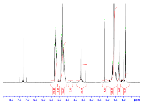 mPEG-PLGA共聚物在CDCl3中的H-NMR光譜(Varian Inova 500MHz儀器)、mPEG-PLGA重復單元的NMR:EG-LA/GA=70*-319/333(錳3084-22950/19346) |