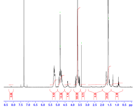 共聚物在CDCl3中的H-NMR光譜(Bruker≥300MHz,PINMRF)mPEG-PLGA共聚物的NMR:EG/LA-GA=103/26-25(Mn EG/LA:GA 4526/1900:1476 Da)(基于甲氧基峰3.4 ppm) |