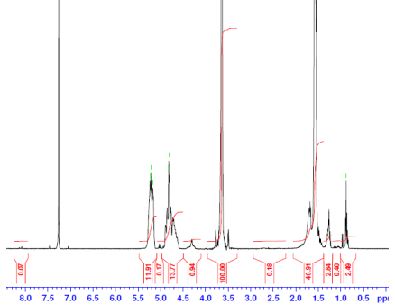 共聚物在CDCl3中的H-NMR光譜(Bruker 500MHz,PINMRF)PLGA-PEG共聚物的NMR:EG/LA-GA=227/108-63(Mn EG/LA:GA 10000*/7786:3628 Da)*來(lái)自MFG的估計(jì)值 |