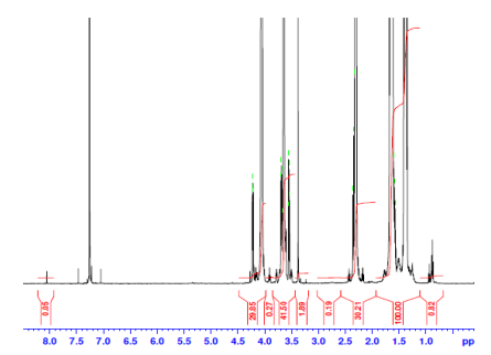 共聚物在CDCl3(Varian Inova 500 MHz)中的H-NMR光譜儀器)mPEG-PCL重復單元的NMR:EG-CL=17-24(Mn749*-2791Da)(*MFG標稱值) |
