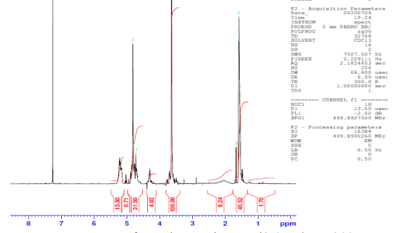 共聚物在CDCl3中的H-NMR光譜(Bruker≥300MHz,PINMRF)PLGA-PEG共聚物的NMR:EG/LA-GA=50/27-31.5(錳EG/LA:GA 2203*/1944:1828 Da) |