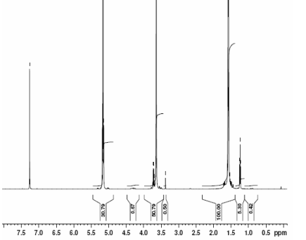 mPEG-PLLA共聚物在CDCl3中的H-NMR光譜(VarianInova 500 MHz儀器),mPEG-PDLLA的NMR共聚物:EG/LA=3040/11929 |