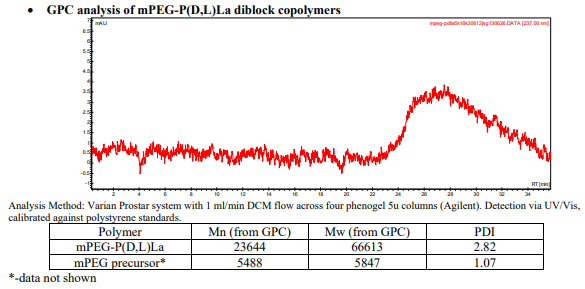 中文名稱:mPEG-PDLLA / 甲氧基聚(乙二醇)-b-聚(D,L-丙交酯),(Mw ~5,000:18,000 Da)