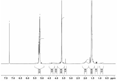 mPEG-P(D,L)LA共聚物在CDCl3中的H-NMR譜(Varian Inova 300 MHz儀器),mPEG-P(D,L)LA的NMR重復(fù)單位:EG-LA=115*-247(Mn HNMR-5066*-17791)(*-data |