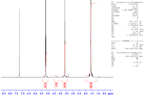 共聚物在CDCl3(Bruker≥300MHz,PINMRF)mPEG-PLLA共聚物的NMR:EG/LA=123*/332(Mn EG/LA 5419*/23886Da)*——來自MFG數(shù)據(jù) |