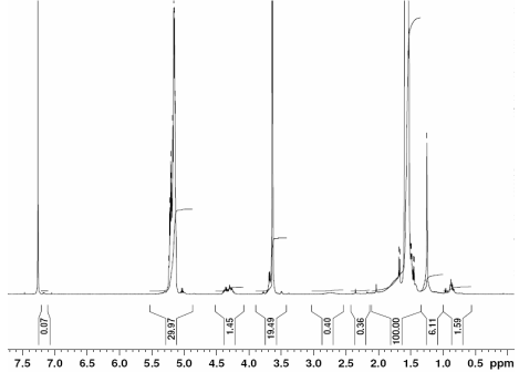 PLA-PEG-PLA共聚物在CDCl3中的H-NMR譜(Varian Inova 500 MHz儀器),PLA-PEG-PLA重復(fù)單元的NMR:EG-LA=23-141 |