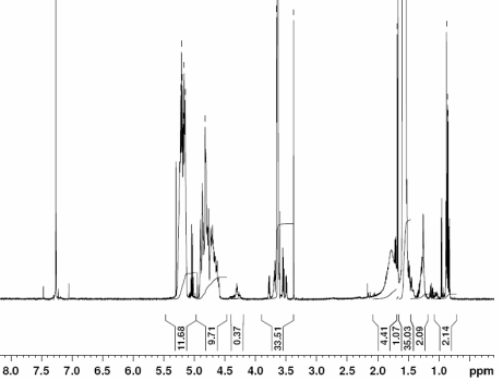 PLGA共聚物在CDCl3(Varian Inova)中的H-NMR光譜500MHz儀器),mPEG-PLGA共聚物的NMRmPEG-PLGA重復(fù)單元:EG-GA/LA=69-40/97(Mn:3056-2348/7008 Da) |