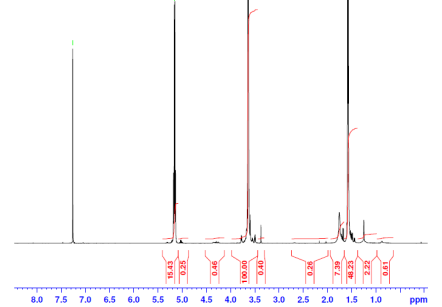 mPEG-P(L)LA共聚物在CDCl3中的H-NMR譜(瓦里安Inova 500 MHz儀器),mPEG PLLA核磁共振重復單位:EG-LA=227-140(Mn HNMR 10000-10088DA) |