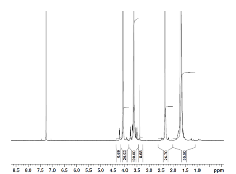 mPEG-PVL共聚物在CDCl3(Varian)中的H-NMR譜Inova 300 MHz儀器),mPEG PVL重復單元的NMR:EGVL=115-60(Mn:5066*-5994)*-制造數(shù)據(jù) |