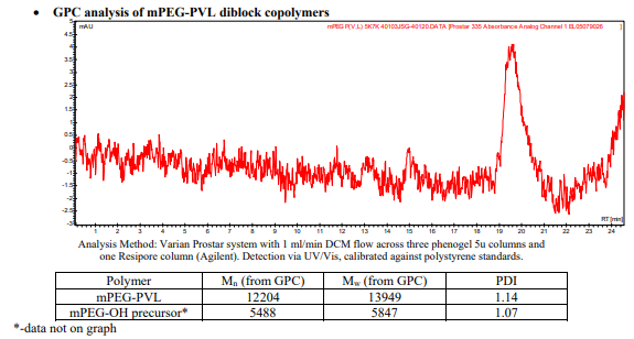 英文名字:mPEG-PVL / Methoxy poly(ethylene glycol)-b-poly(delta-valerolactone), (Mw ~5,000:7,000 Da) (42% PEG)