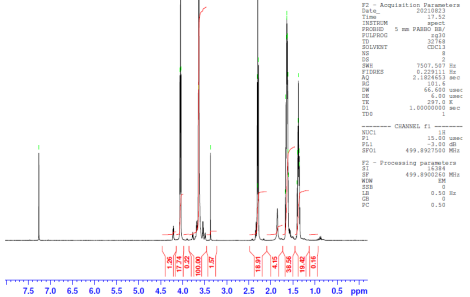 共聚物在CDCl3(Bruker≥300MHz,PINMRF)mPEG-PCL重復(fù)單元的NMR:EG/CL=44/16(MnEG/CL 1938年*/1782 Da) |