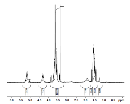 mPEG-P(D,L)LA共聚物在CDCl3中的H-NMR譜(Varian Inova 300 MHz儀器),mPEGP(D,L)LA重復(fù)單元的NMR:EG-LA=51-5(Mn HNMR 2247-347) |