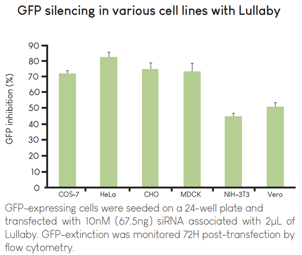 Lullaby是理想的基因沉默siRNA轉(zhuǎn)染試劑。依靠TEE技術(shù)(OZ Biosciences:脂質(zhì)轉(zhuǎn)染試劑解決方案一文)它已在許多細(xì)胞系上成功測(cè)試,達(dá)到高達(dá)90%的基因沉默,具有高重現(xiàn)性和極低的毒性。它保護(hù)siRNA免受細(xì)胞外降解,并具有破壞細(xì)胞膜穩(wěn)定的杰出能力。它允許將重要量的siRNA可重復(fù)地遞送到細(xì)胞質(zhì)中,并且在每次實(shí)驗(yàn)中維持高細(xì)胞活力。