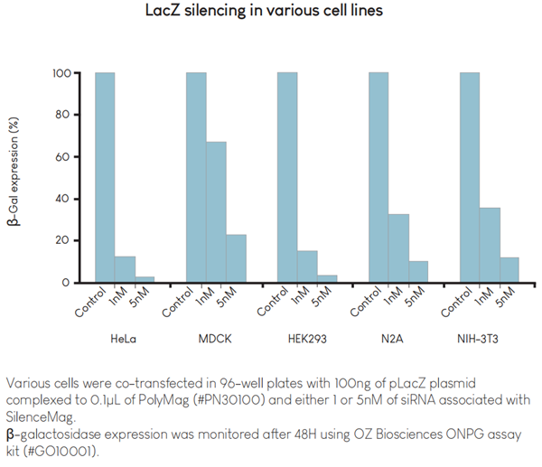SilenceMag是專門為siRNA遞送而開(kāi)發(fā)的。這些磁性納米顆粒涂覆有獨(dú)特的陽(yáng)離子脂質(zhì)制劑,提供了可用的最有效的siRNA遞送系統(tǒng)。由于磁場(chǎng)介導(dǎo)的siRNA在細(xì)胞上的濃度,它允許在非常低劑量的siRNA下研究基因沉默。該試劑適用于所有siRNA應(yīng)用,并在許多細(xì)胞類型中提供可靠且高的基因敲低。