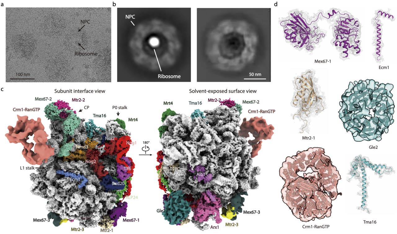處于NPC孔道內(nèi)核糖體前體(pre-60S)的高分辨結(jié)構(gòu),展示了pre-60S通過NPC孔道過程中構(gòu)象和組成變化,闡述了NPC協(xié)助pre-60S進行出核轉(zhuǎn)運的分子機制,為進一步理解NPC轉(zhuǎn)運生物大分子的生理功能提供了重要的理論依據(jù)。