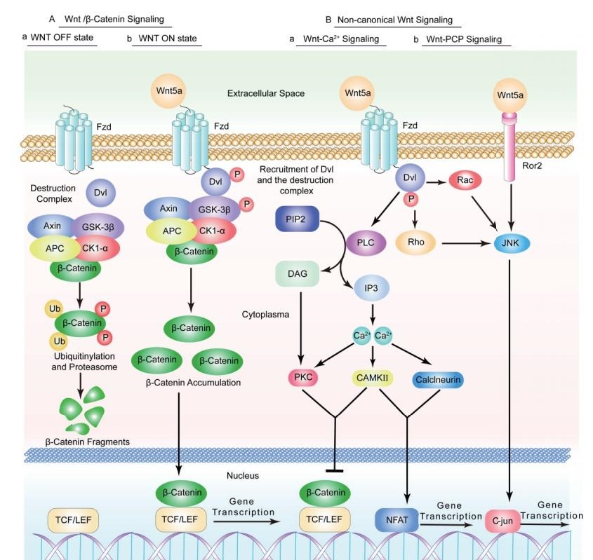 Wnt信號通路是胚胎及器官發(fā)育的重要信號通路之一,參與調(diào)控機(jī)體內(nèi)多種細(xì)胞的增殖、分化、極化、遷移及凋亡等過程。Wnt信號通路根據(jù)是否依賴于 β-catenin的轉(zhuǎn)錄活化,可分為經(jīng)