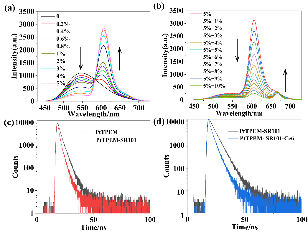 圖2. (a)向PtTPEM中加入不同量的SR101的發(fā)射光譜變化圖。(b)向PtTPEM-SR101體系中加入不同量的Ce6的發(fā)射光譜變化圖。(c)PtTPEM與PtTPEM-SR101(20:1)的熒光壽命衰變曲線。(d)PtTPEM-SR101與PtTPEM-SR101-Ce6(20:1:2)的熒光壽命衰變曲線。