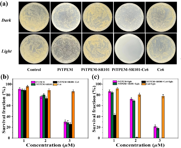 圖3. (a)分別用PtTPEM、PtTPEM?SR101(20:1)、PtTPEM?SR101?Ce6(20:1:2)和Ce6處理的金黃葡萄球菌,在光照條件或黑暗條件下的瓊脂平板上的照片(c = 10 μM);在黑暗(b)和光照射(c)下,對PtTPEM、PtTPEM?SR101(20:1),PtTPEM?SR101?Ce6(20:1:2)和Ce6濃度的大腸桿菌活性。