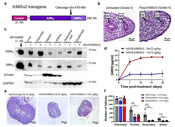 在本研究中使用了AAV9在成年家貓中傳遞AMH轉(zhuǎn)基因(稱為fcMISv2)。結(jié)果表明,這種避孕措施可以防止繁殖誘導(dǎo)的排卵,導(dǎo)致完全不育,并可能構(gòu)成一種安全和持久的策略來控制家貓的繁殖。
