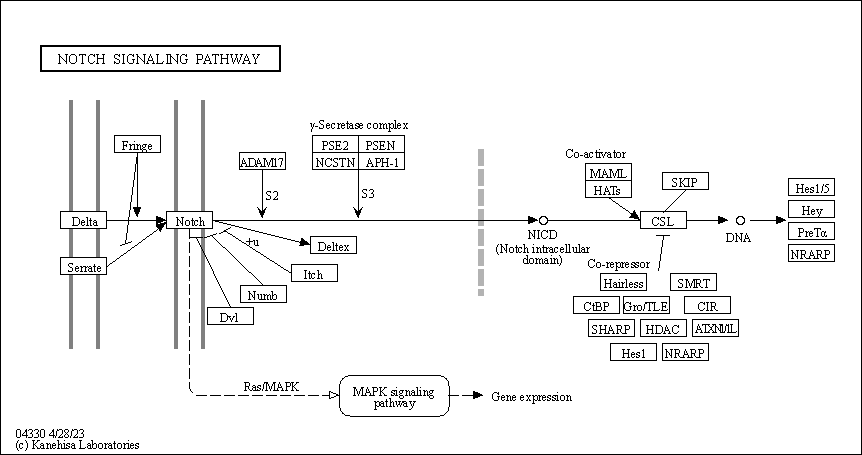 Notch信號通路主要由四部分組成:Notch受體、Notch配體、CSLDNA結(jié)合蛋白、下游靶基因。上述四部分中任何一個因素改變都會對Notch信號通路傳遞產(chǎn)生影響。