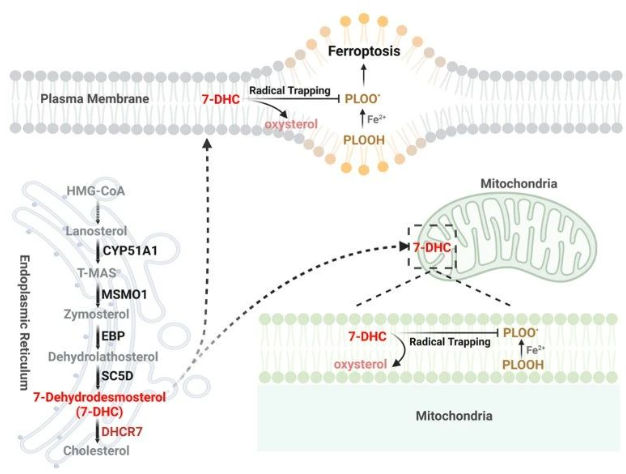 發(fā)現(xiàn)遠(yuǎn)端膽固醇合成途徑中產(chǎn)生的中間甾醇7-DHC是一種新的鐵死亡內(nèi)源抑制因子,闡明了7-DHC依賴其5,7-不飽和雙鍵的結(jié)構(gòu)特性直接抑制磷脂過(guò)氧化的具體機(jī)制,提示甾醇與磷脂的過(guò)氧化在鐵死亡過(guò)程中具有不同作用。