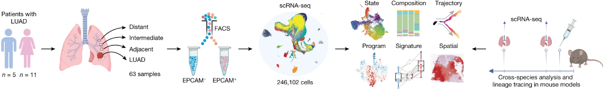 在早期肺腺癌組織和癌旁區(qū)域發(fā)存在一群攜帶KRAS致癌基因突變的,KRT8表達(dá)陽(yáng)性的肺泡中間態(tài)細(xì)胞,并證實(shí)了這種細(xì)胞最終可轉(zhuǎn)化為肺腺癌細(xì)胞。