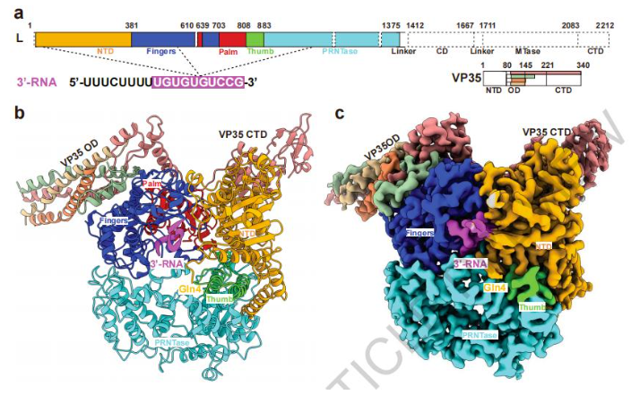 《自然》揭示埃博拉病毒聚合酶從頭復制的分子機制,進一步的誘變工作證實了RNA的彎曲構象是從頭復制活性所需的,并揭示了L蛋白中穩(wěn)定RNA構象的關鍵殘基。這些發(fā)現為非節(jié)段負鏈RNA病毒(nsNSV)聚合酶的RNA合成提供了新的機理認識,并揭示了開發(fā)抗病毒藥物的重要靶點。