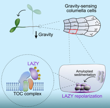 報道了重力刺激觸發(fā)MKK5-MPK3模塊磷酸化LAZY蛋白,這可能通過與TOC蛋白相互作用促進LAZY蛋白在淀粉質體表面富集。然后,淀粉體沉積促進了小柱細胞中LAZY蛋白向新的質膜下側的易位,其中LAZY蛋白從淀粉體表面重新定位到鄰近的質膜是一個重要的過程。