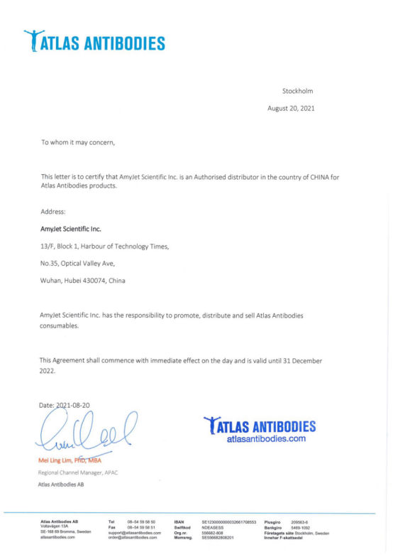 作為Atlas Antibodies在中國(guó)的區(qū)域總代理,艾美捷科技有限公司將為中國(guó)客戶(hù)提供最全面的Atlas Antibodies產(chǎn)品。下圖為Atlas Antibodies公司授權(quán)艾美捷科技有限公司(AmyJet Scientific Inc.)作為Atlas Antibodies在中國(guó)區(qū)域的代理授權(quán)書(shū):
