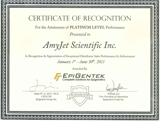 喜報(bào)!艾美捷科技榮獲Epigentek 2021上半年中國區(qū)鉑金(最高級(jí)別)代理商獎(jiǎng)!