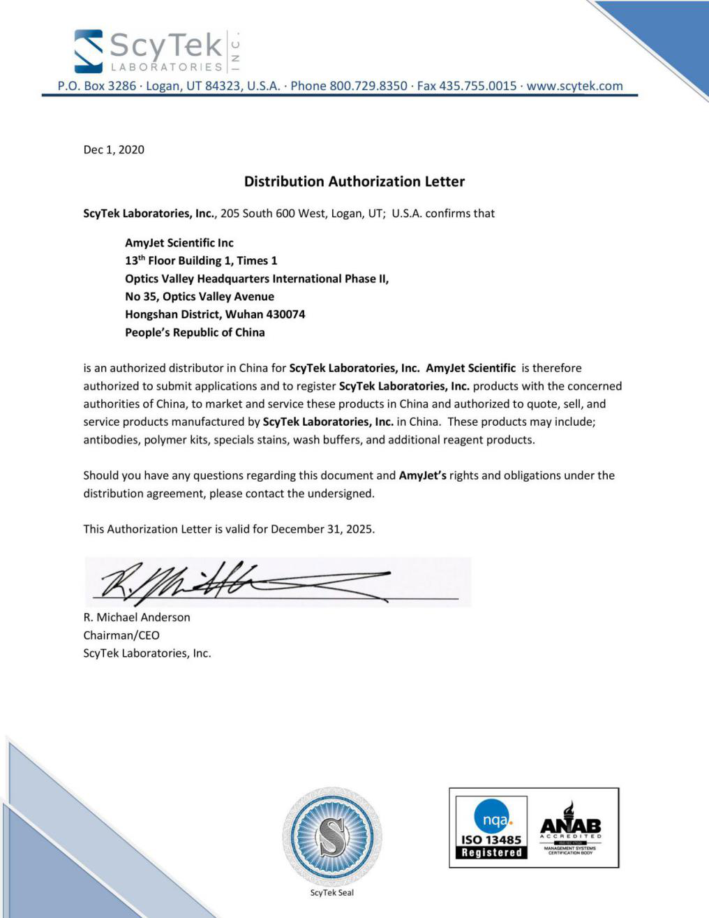 作為ScyTek在中國(guó)的區(qū)域總代理,艾美捷科技有限公司將為中國(guó)客戶提供最全面的ScyTek產(chǎn)品。下圖為ScyTek公司授權(quán)艾美捷科技有限公司(AmyJet Scientific Inc.)作為ScyTek在中國(guó)區(qū)域的代理授權(quán)書。