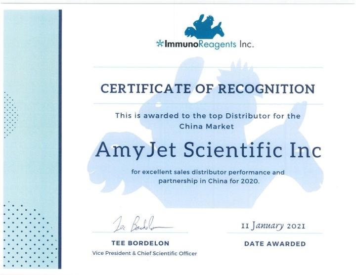作為ImmunoReagents在中國(guó)的區(qū)域總代理,艾美捷科技積極推廣ImmunoReagents品牌產(chǎn)品,為廣大科研工作者提供ImmunoReagents優(yōu)質(zhì)的產(chǎn)品與服務(wù),業(yè)績(jī)表現(xiàn)卓越。受到了終端客戶,各地經(jīng)銷商以及ImmunoReagents廠家的高度認(rèn)可: