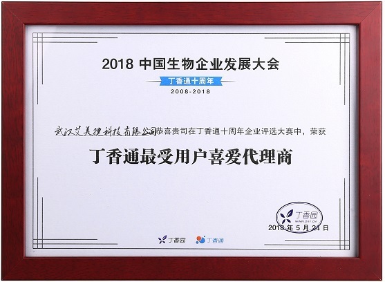 艾美捷以優(yōu)質(zhì)的技術(shù)服務(wù)及產(chǎn)品質(zhì)量,榮獲丁香通“最受用戶喜愛(ài)代理商”獎(jiǎng)杯。