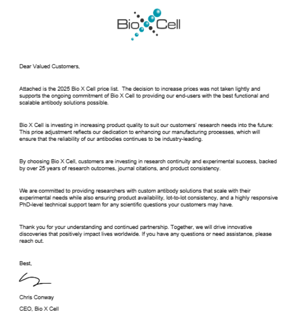 艾美捷收到Bio X Cell 廠家最新通知,自2025年1月1日起B(yǎng)io X Cell產(chǎn)品價格將全面上調。作為Bio X Cell的中國代理商,艾美捷科技也將從2025年1月1日起,對Bio X Cell產(chǎn)品的人民幣價格做出相應調整。