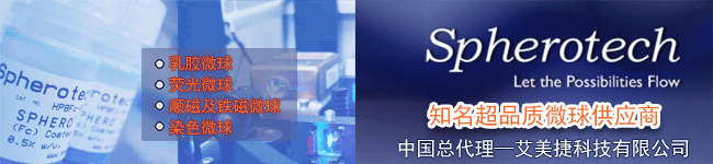 Spherotech公司是全球知名的微球產(chǎn)品生產(chǎn)商之一。Beckton Dickinson(BD)公司即用Spherotech的Rainbow熒光微球來(lái)對(duì)其流式細(xì)胞儀進(jìn)行靈敏度的校驗(yàn)。Spherotech公司生產(chǎn)的微球廣泛的應(yīng)用于生物醫(yī)學(xué)研究和診斷,包括免疫熒光和免疫酶學(xué)檢測(cè)等。其微球適用于熒光顯微鏡技術(shù)、激光共聚焦(Confocal)技術(shù)、流式細(xì)胞術(shù)、影像細(xì)胞術(shù)、磁性細(xì)胞分離技術(shù)、磁珠酶免測(cè)定法(EIA)等多種檢測(cè)方法。Spherotech常規(guī)生產(chǎn)高質(zhì)量的乳膠微球、熒光微球、順磁性微球、鐵磁性微球和多種有色微球,這些微球表面可根據(jù)應(yīng)用的需要添加不同的功能基團(tuán)(如羧基和氨基等)。此外,Spherotech公司還生產(chǎn)各種包被有抗體或配體,如親合素、鏈霉親合素和生物素等的微球,用于免疫學(xué)的研究和臨床。